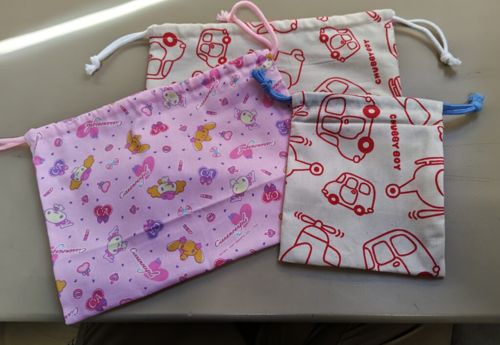 写真はコーヒードリップ、通園バッグ、巾着袋(各サイズ)です。