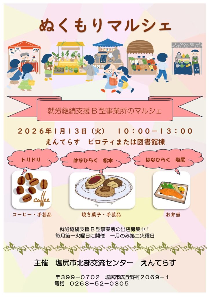 マルシェ参加のお知らせ / News / By toridori ぬくもりマルシェはいつもは毎月第一火曜日ですが、一月だけ第二火曜日になりました。 2026年もマルシェにどんどん参加していきます! よろしくお願いします。